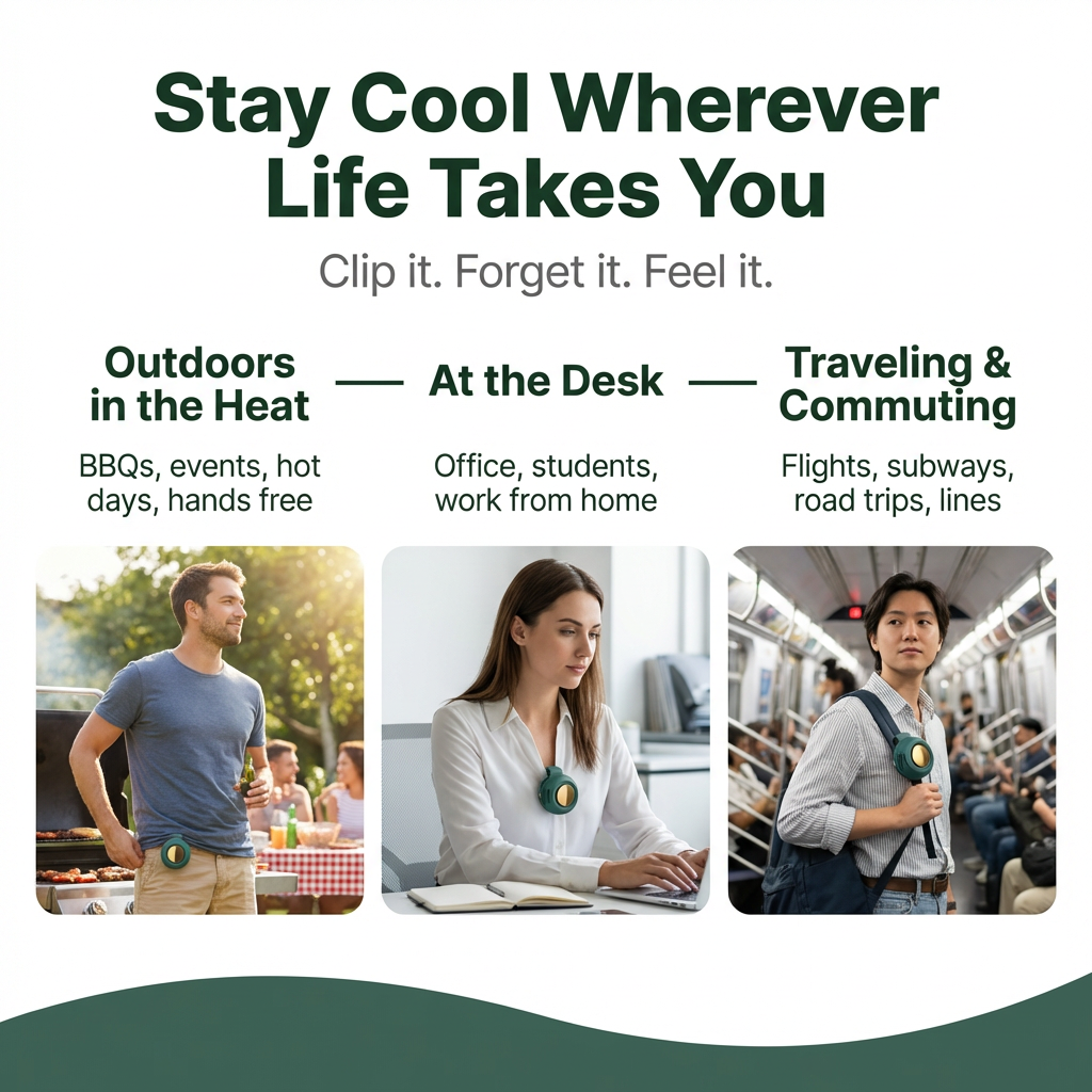 Whether you're sweating through your commute, stuck in a warm office, or soaking up the sun outside. BreezeBuddy clips on in seconds and keeps you cool. No holding. No hassle. Just instant relief wherever you are.